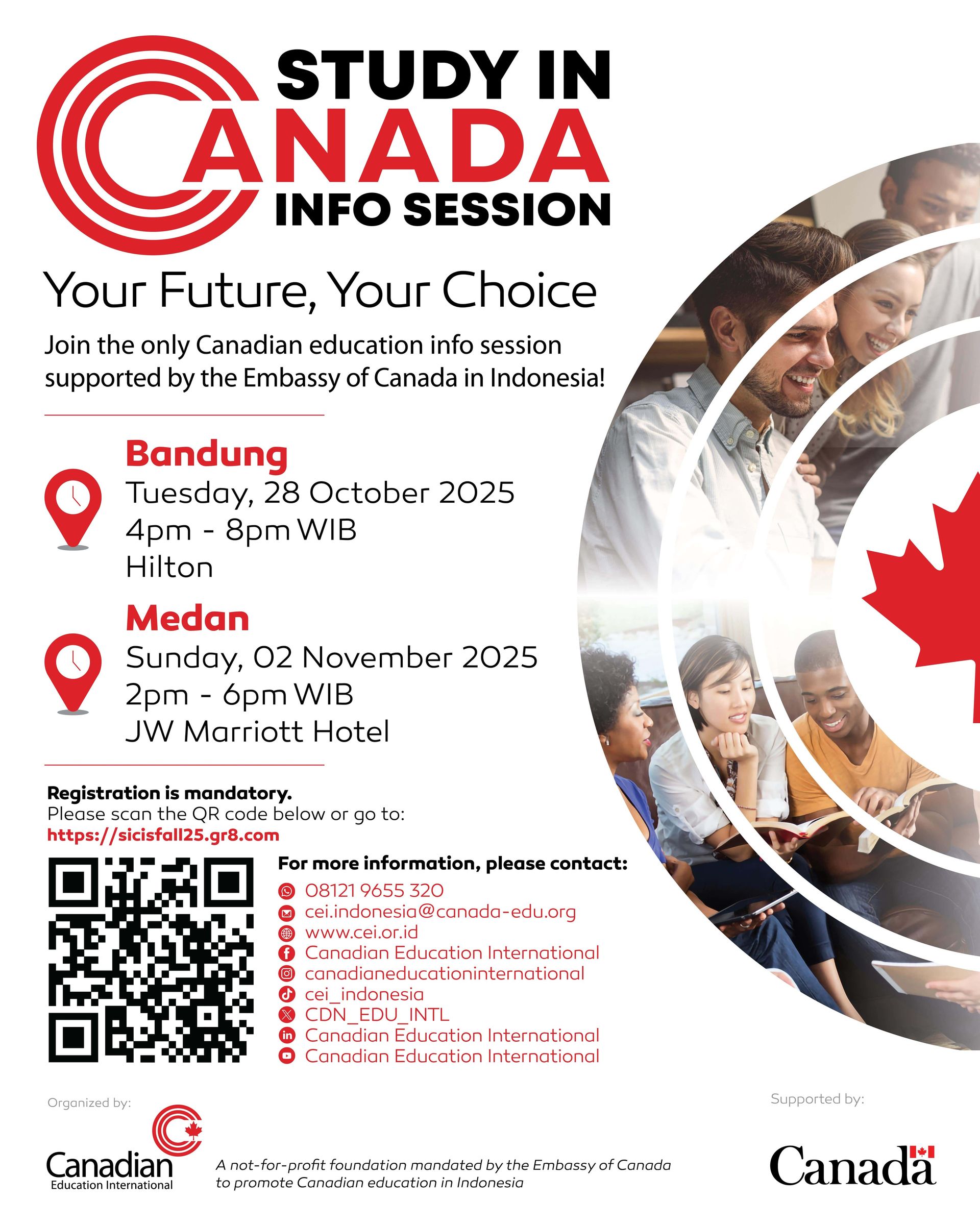 Canadian Education International – Indonesia is pleased to announce that the Study in Canada Info Session, the only Canadian education info session supported by the Embassy of Canada in Indonesia, are coming to Bandung and Medan this October!